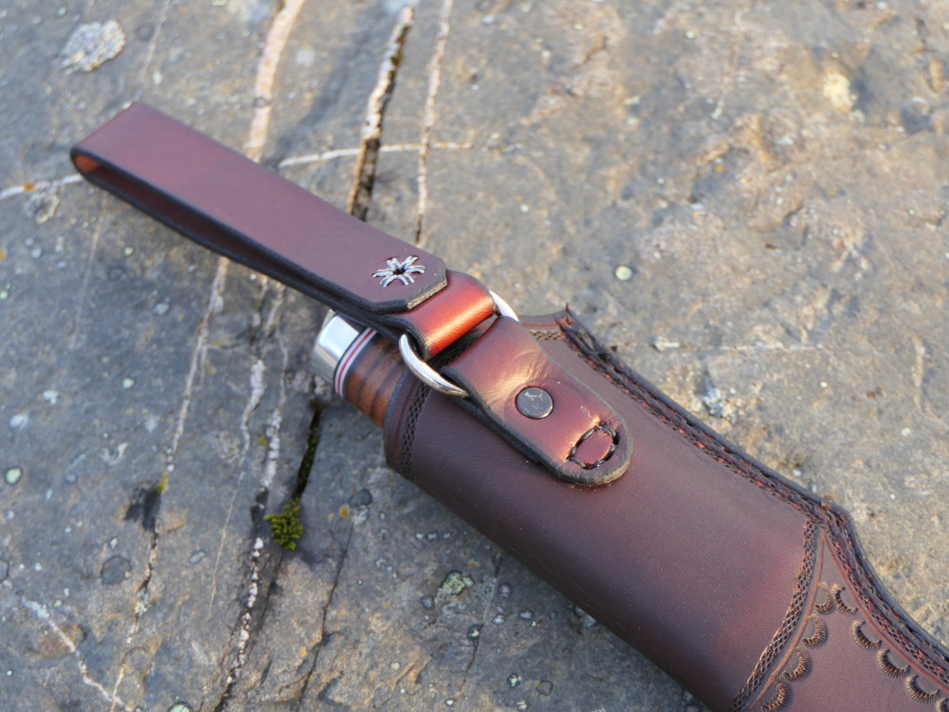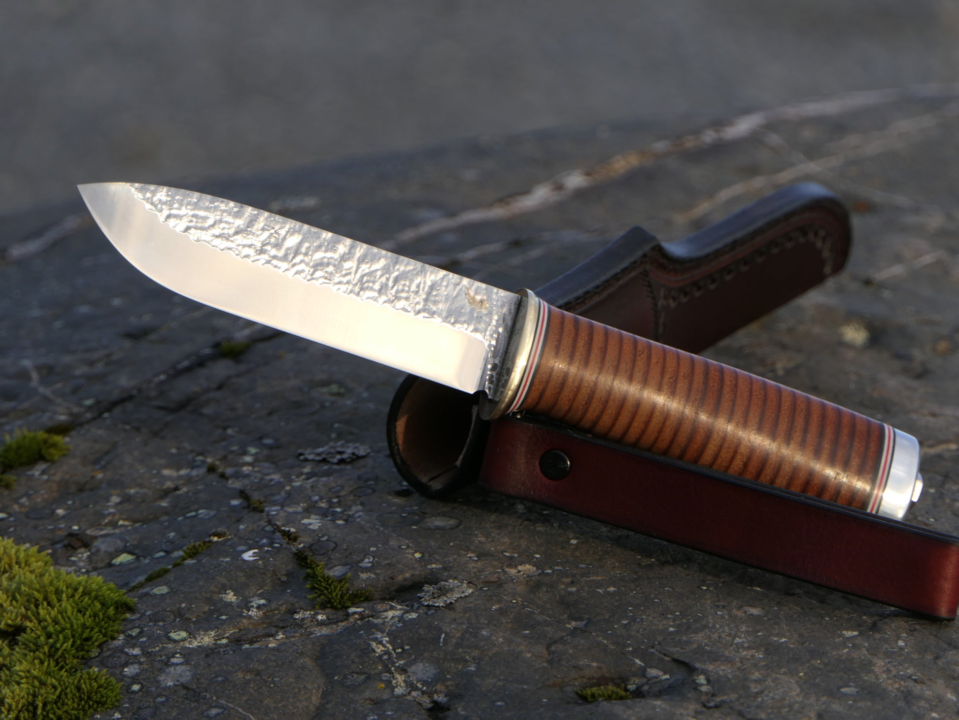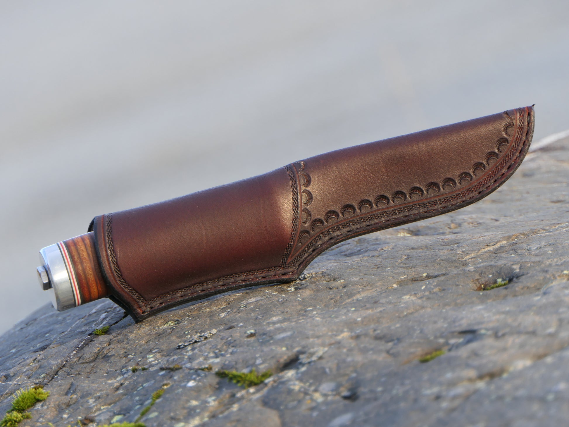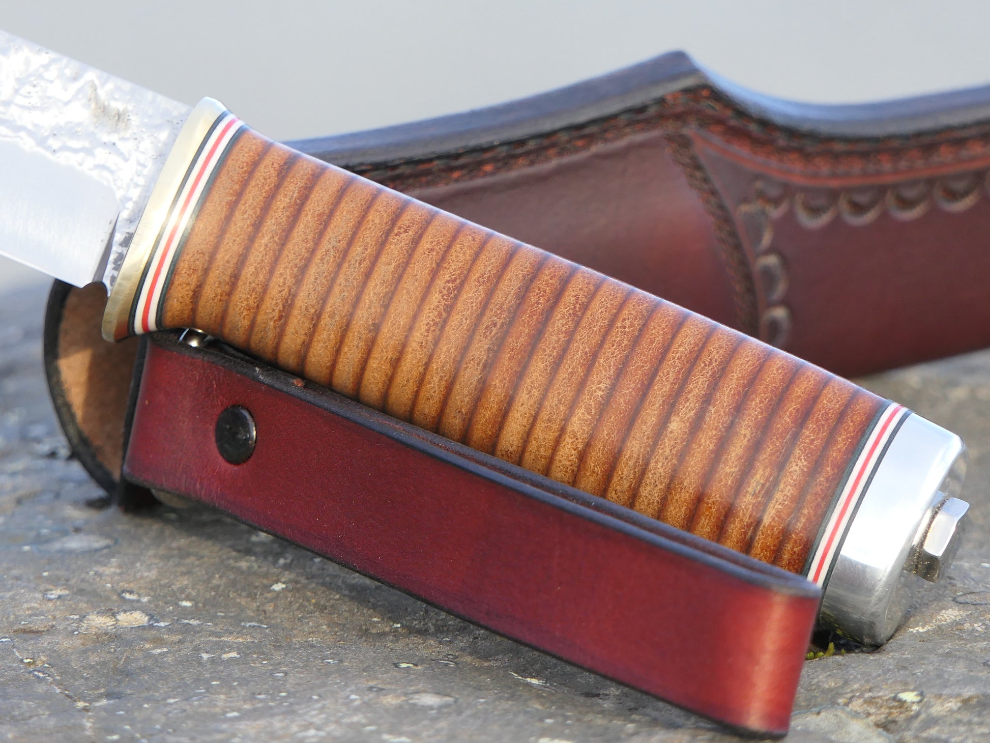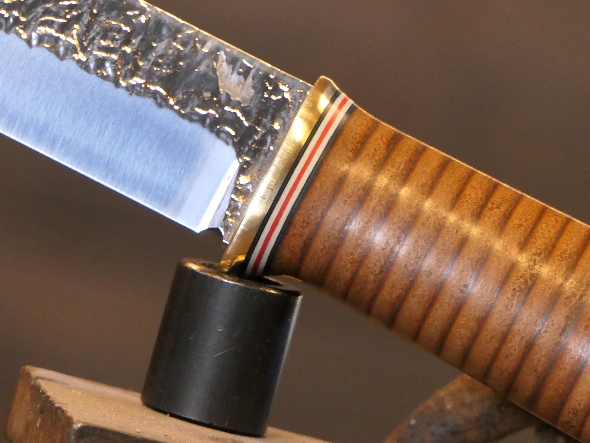 Handle: stacked leather, liners, brass guard and Alu cap.
